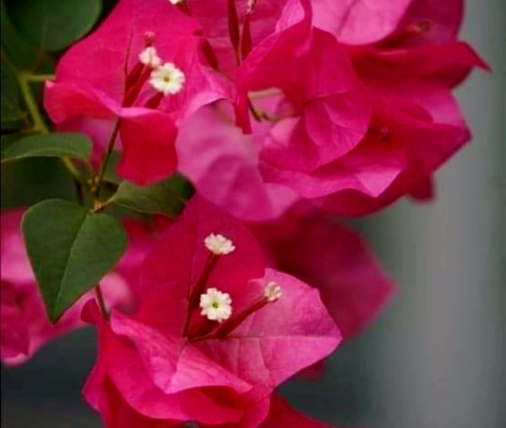 Logo ao lado uma bouganville, sorrindo e até tombada de flores.